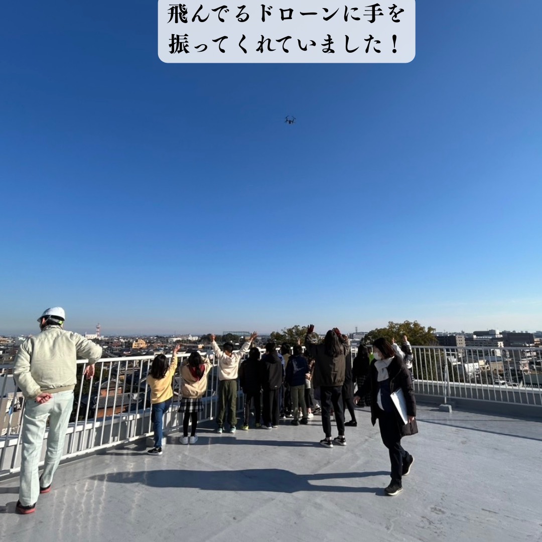 空から現場を撮影するドローンを間近で見学。小学生は弊社屋上から見ていましたが、地上から会社の屋上を超えて、空高く上がるドローンに「すごい!」と驚愕の声が止まりませんでした!