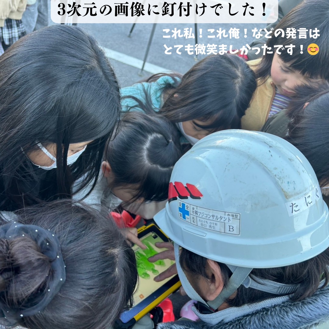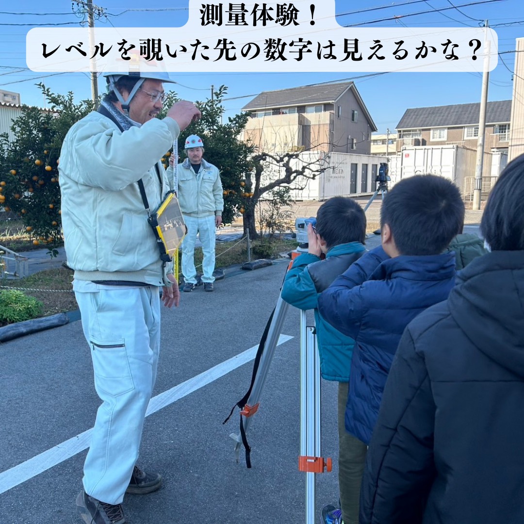 プロが使う道具に触れながら、現場のはじまりとなる測量の大切さを体験。真剣にのぞきこむ姿や最新技術に触れ驚愕する姿がとても印象的でした!
